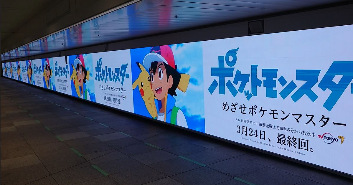 アニポケはこの春、サトシから新主人公にバトンタッチすることは話題になっていますが、新宿駅の通路で映し出されている映像では、サトシの旅のこれまでを約1分半の映像で見ることができるようになっています。ただ、たくさんのモニターで映し出しており、すべてを見るには何度もいろんなモニターを確認しなければなりません。